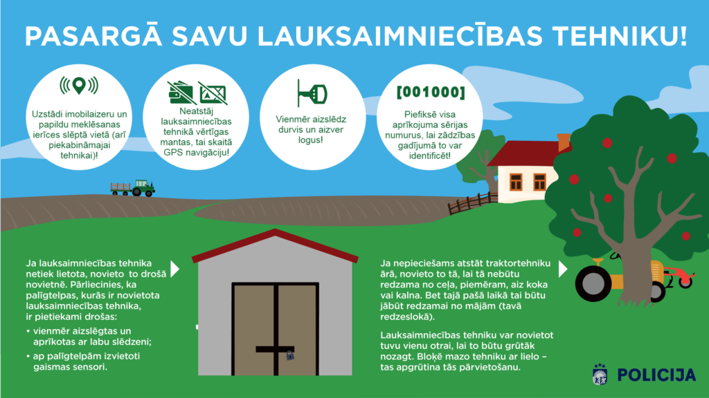 Vienlaikus vēršam uzmanību, ka, iestājoties siltākiem laikapstākļiem un lauksaimniekiem plānojot zemes apstrādāšanas darbus, ir jāpadomā arī par tehnikas drošu uzglabāšu. Valsts policija ikdienā aktīvi strādā un veic dažādus profilaktiskos pasākumus, lai novērstu traktortehnikas zādzību riskus, un aicina ne tikai lauksaimniekus, bet arī lauksaimniecības tehnikas tirgotājus ievērot dažus ar tehnikas drošu glabāšanu un uzraudzību saistītus padomus: