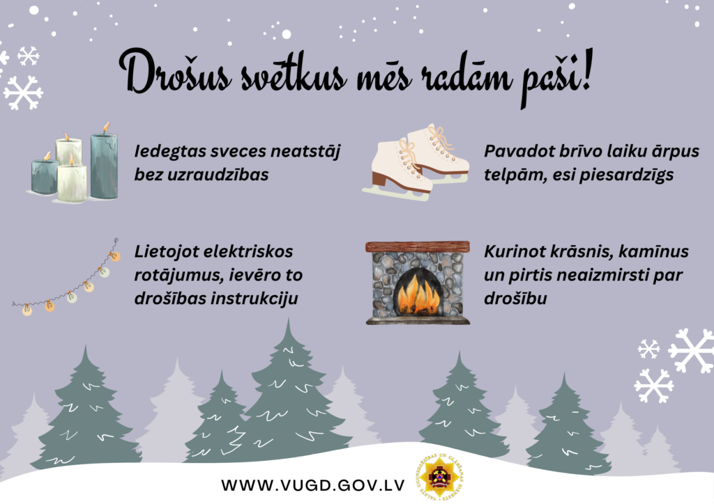 Ziemassvētki un Jaunais gads ir svētki, kurus gaida gan pieaugušie, gan bērni. Lai šie svētki būtu droši Valsts ugunsdzēsības un glābšanas dienests ir apkopojis galvenos ieteikumus drošai svētku norisei, kas pieejami šeit -https://www.vugd.gov.lv/lv/svetku-laika
