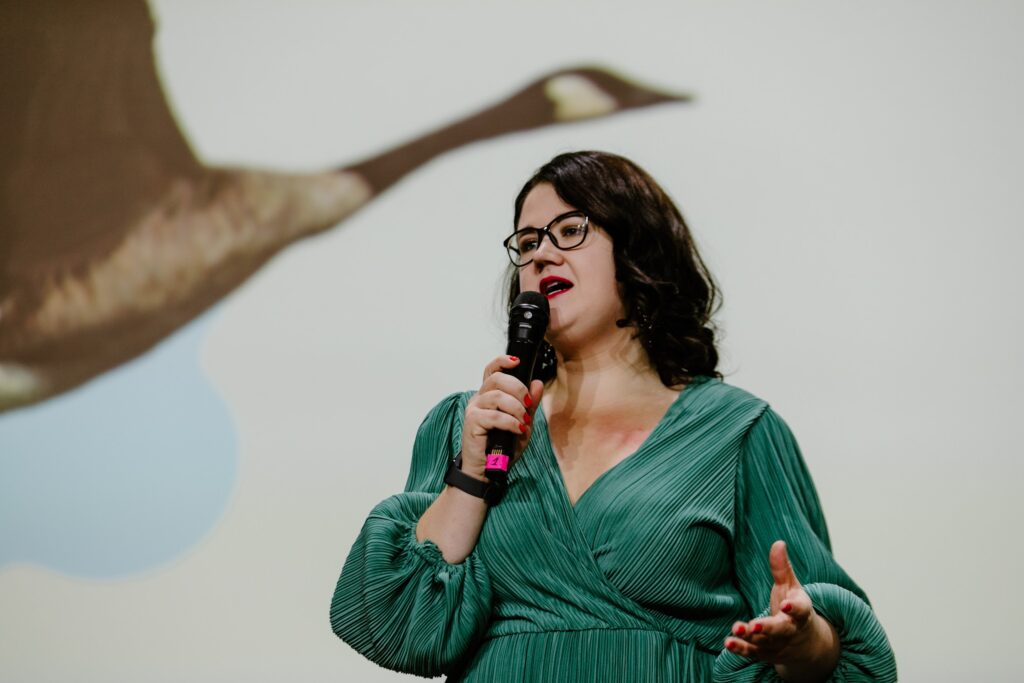 Latvijas Kultūras akadēmijas lektore, aktrise Zane Daudziņa stāstīja par to, cik svarīgs ir ārējais veidols, balss un izteiktais vārds. Daudziņa min, ka neviena uzstāšanās komponente nav derīga bez otras. Uzstājoties ir jāatceras atslēgas elementi – acu kontakts, stabila stāja, smaids auditorijai.