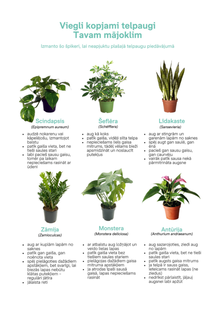 Monstera (Monstera deliciosa) – ar atbalstu aug ložņājot un veido lielas lapas; patīk gaiša vieta bez tiešiem saules stariem; pielāgojas dažādiem gaisa mitruma apstākļiem; ja atrodas īpaši sausā telpā, lapas nepieciešams aprasināt.