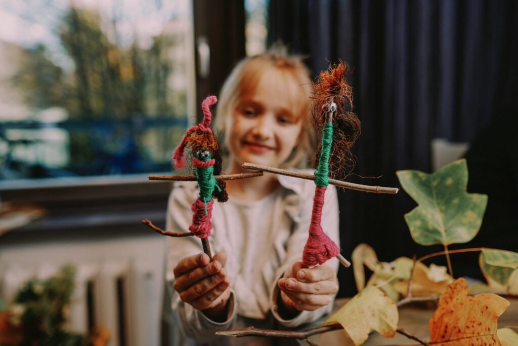 Nepieciešams: koku zari, kam vienā galā veidojas “kājas”, dzija, karstā līme, dažādi materiāli, ko iespējams izmantot matu un acu veidošanai.
