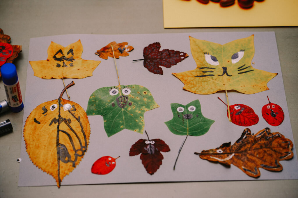 Darba uzdevums: uz papīra lapas izveidot koka lapu kolāžu un “atdzīvināt” lapas, uzzīmējot tām sejas.