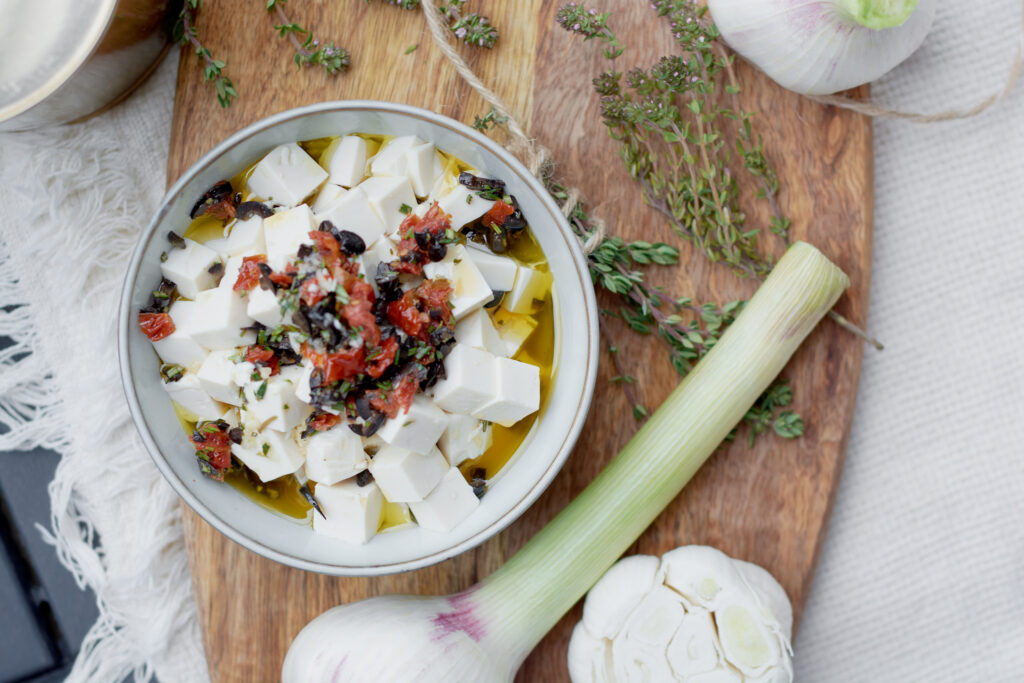 - Pārlej eļļas maisījumu pāri sieram, uzliec burkai vāku vai aptin trauka virsmu ar pārtikas plēvi un atstāj uz 3-4 stundām marinēties istabas temperatūrā (ja izmanto tikai olīveļļu, tad sieru nevajag likt ledusskapī, jo olīveļļa vēsumā sastingst. Ja marinādei izmanto olīveļļas un rapšu eļļas maisījumu, tad var uzglabāt arī ledusskapī).