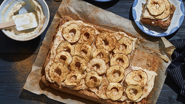 Ingvera ābolu kūka ar krēmīgu kanēļa glazūru un dekoratīviem ābolu gredzeniem.