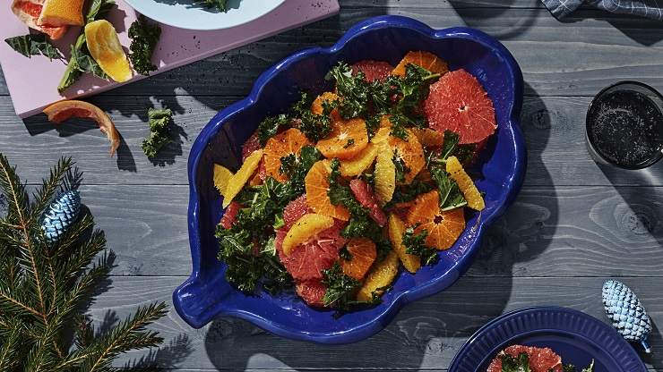 Svaigi kale kāpostu salāti ar citrusaugļiem, piemēroti pasniegšanai kopā ar lasi, vistu un cūkgaļu.