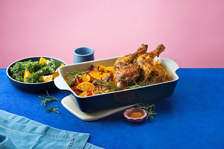 - Cepamajā traukā liec sasmalcinātus dārzeņus un apelsīnu daiviņas, apslaki ar 2–3 ēdamkarotēm olīveļļas un kļavu sīrupu, pārkaisi ar sāli un pipariem, kārtīgi samaisi.
