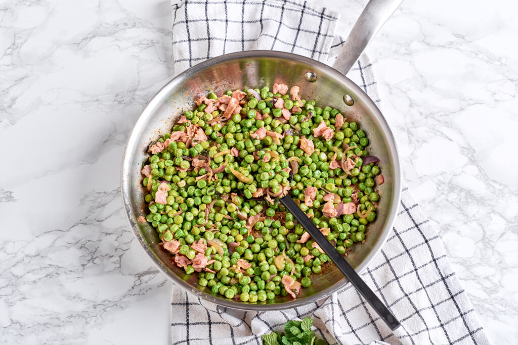 Uz sausas pannas apcep bekonu, līdz tas kļūst kraukšķīgs. Noņem to no pannas un nosusini no liekajiem taukiem uz papīra dvieļa. Katlā uzvāri ūdeni un ber tajā saldētus zirnīšus, vāri 4-5 minūtes, tad ūdeni nokās. Apcep uz pannas olīveļļā sīpolus un ķiplokus, pieber tiem vārītus zirnīšus un, visu apmaisot, cep vēl dažas minūtes. Pielej dārzeņiem citrona sulu, pievieno sāli, piparus un zaļumus, maisot apcep vēl ~ 1 minūti. Beigās pievieno bekonu, apmaisi un pasniedz.