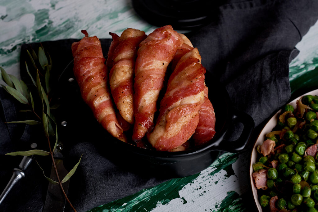 Bekonā ietīti vistu filejas gabaliņi, kur ir gan putnu gaļa panākumiem, gan cūkgaļa laimei