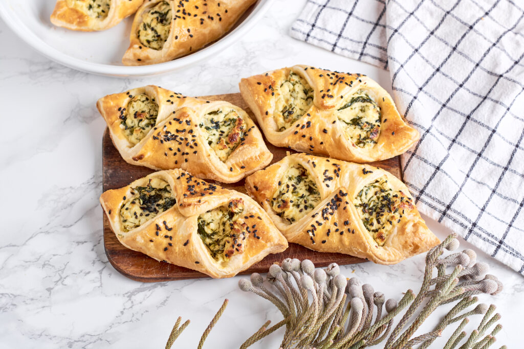 Sviestā apcep sīpolus, pievieno tiem smalki sakapātus spinātus, lociņus un dilles, apcep ~3 min līdz zaļumi izdalījuši visu šķidrumu. Bļodā sajauc biezpienu ar olu, grieķu jogurtu, pievieno masai apceptus zaļumus, sāli, piparus, visu samaisi līdz viendabīgai konsistencei. Mīklas plāksnes atlaidini un sagriez uz pusēm, lai veidojas nelieli mīklas kvadrātiņi. Uz katra mīklas kvadrāta liec pa ēdamkarotei biezpiena maisījuma, pārloki divus pa diagonāli pretējos mīklas stūrīšus pār pildījumu un savieno viducītī. Apsmērē pīrādziņus ar sakultu olu un liec cepties sakarsētā cepeškrāsnī (180-190 grādos). Cep ~20 minūtes, kamēr pīrādziņi ir zeltaini un izskatās gatavi.