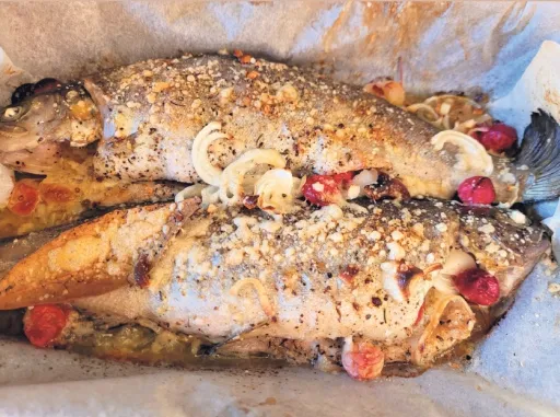 ŠEIT NEPIECIEŠAMO produktu daudzums atkarīgs no ēdāju skaita. Izķidātas strauta foreles ierīvē ar sāli, tajās iekaisa maltus melnos piparus un nedaudz Vidusjūras garšvielu maisījuma. Katrā forelē ieliek plānās šķēlītēs sagrieztu ķiploka daiviņu un dažas plānas sīpola ripiņas, kā arī kādas četras dzērvenes. Cep cepeškrāsnī apmēram 200 grādu temperatūrā. Brītiņu pirms beigām uzkaisa nedaudz rīvēta parmezāna.