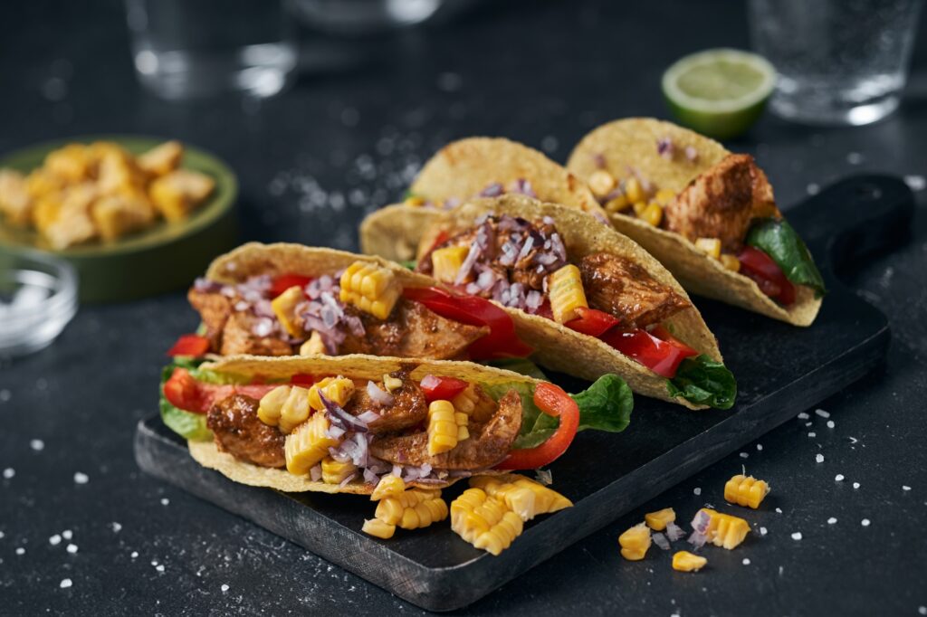 - Kārto tako. Katrā mīkstajā kviešu tortiljā vai cietajā tako laiviņā liek nedaudz zaļu salātlapu, 2 stienīšus sarkanās paprikas, pāris gabaliņu vistas gaļas, tai pāri konservētu kukurūzu un smalki sakapātu sarkano sīpolu.