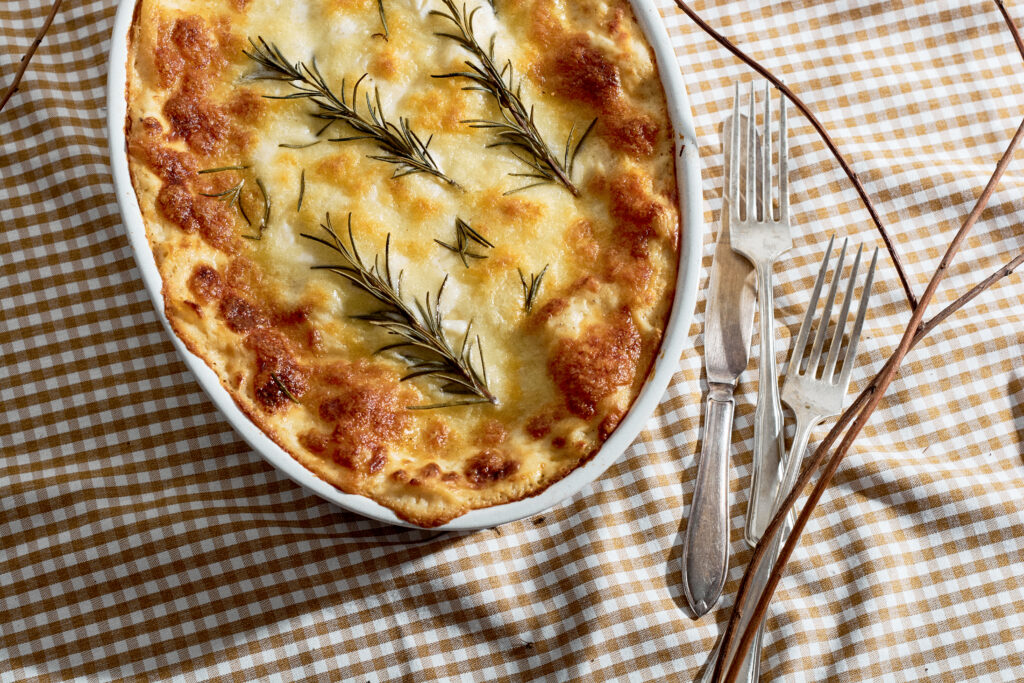 - Kārto lazanju – lielā cepamtrauka pamatnē uzsmērē 2-3 ēdamk. bešamela mērces, tad vienā slānī liec lazanjas plāksnes. Uz tām kārto pusi no ķirbju maisījuma, virsū vienmērīgi kārto kazas siera gabaliņus un uzlej aptuveni pusi bešamela mērces, izlīdzini.
