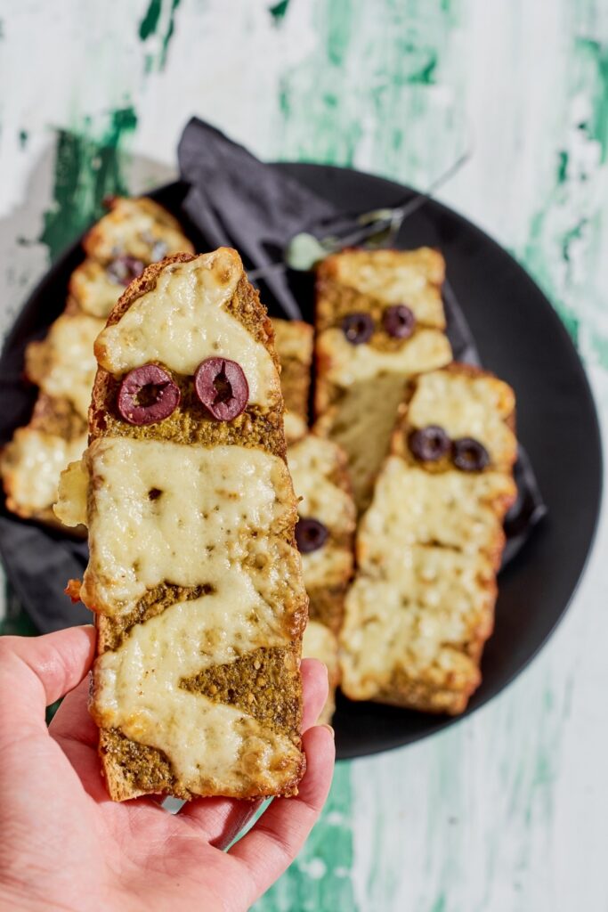 Sagriez plānās ripiņās melnās olīvas, liec uz katras maizītes 2 olīvu ripiņas, lai veidotos mūmijas acis.