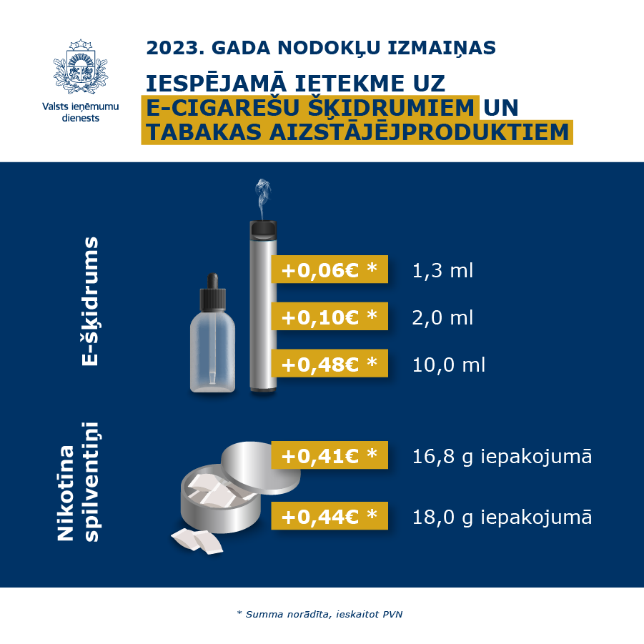 Īstenojot samērīgu un pakāpenisku akcīzes nodokļa likmju paaugstināšanas politiku, 2023.gada 1.janvārī mainās akcīzes nodokļa likmes tabakas izstrādājumiem un elektroniskajās smēķēšanas ierīcēs izmantojamiem šķidrumiem, to sagatavošanas sastāvdaļām (e-šķidrumi) un tabakas aizstājējproduktiem. Tādēļ no 2023. gada 1. janvāra varētu pieaugt minēto produktu mazumtirdzniecības cenas. Līdz ar likmju maiņu šo produktu apritē iesaistītajiem komersantiem jāveic inventarizācija un jāsamaksā akcīzes nodokļa starpības summa par krājumā esošajiem tabakas izstrādājumiem un e-šķidrumiem, informē Valsts ieņēmumu dienesta (VID) Sabiedrisko attiecību daļa.
