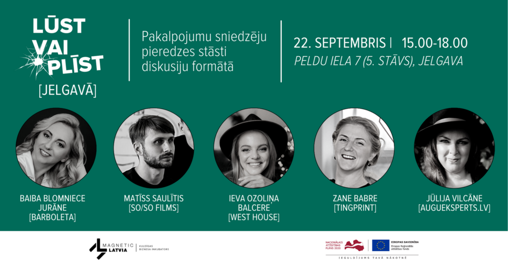 22. septembrī Latvijas Investīciju un attīstības aģentūras (LIAA) Jelgavas biznesa inkubatorā notiks uzņēmēju iedvesmas pasākums “Lūst vai plīst “, kurā pakalpojumu sniedzēji no dažādām nozarēm diskusiju formātā atklās izaicinājumus un neveiksmes, ar kurām tie saskārušies savā uzņēmējdarbībā, informē inkubatora vecākā projektu vadītāja Renāte Bērante. Pasākums ir bez maksas, ar iepriekšēju reģistrāciju : ej.uz/lustvaiplist1