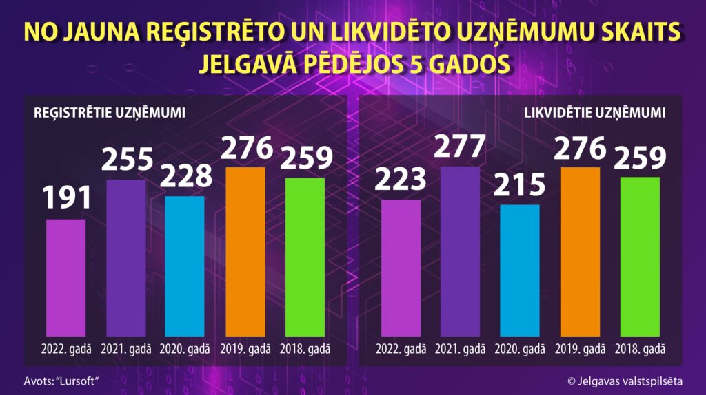 Pēc “Lursoft” datiem, Jelgavā pagājušajā gadā ir reģistrēts 191 jauns uzņēmums, kas ir par 64 mazāk nekā gadu iepriekš – 2021. gadā Jelgavā reģistrēti 255 jauni uzņēmumi. Savukārt Jelgavā pērn likvidēti 223 uzņēmumi (gadu iepriekš – 277), līdz ar to likvidēto uzņēmumu ir par 54 mazāk.