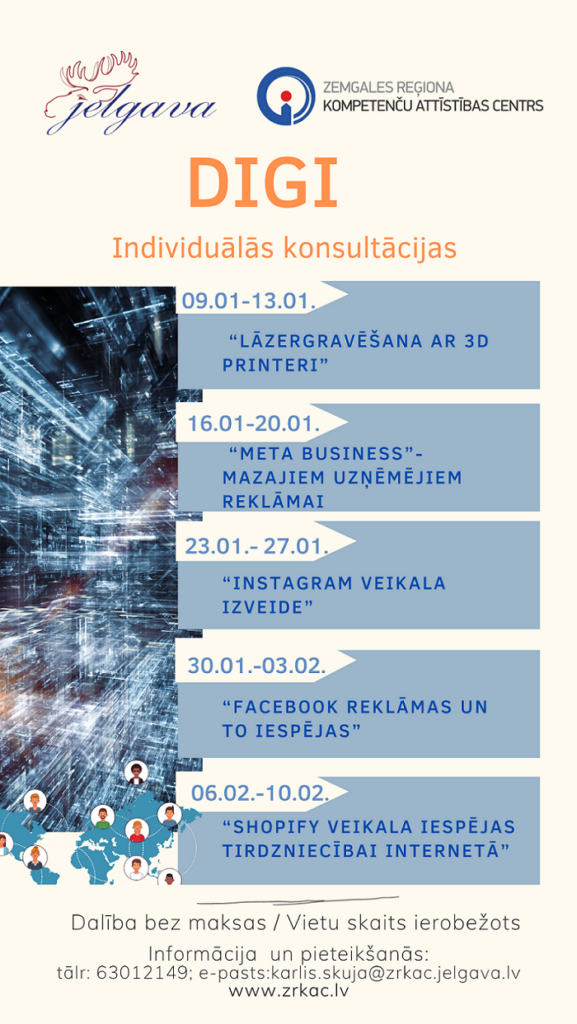 Zemgales reģiona Kompetenču attīstības centrs (ZRKAC) jaunajā gadā esošajiem un topošajiem uzņēmējiem piedāvā individuālās konsultācijas bez dalības maksas. Konsultācijas palīdzēs uzlabot un paplašināt esošās digitālās prasmes, kas paver iespējas biznesa attīstībai, informē ZRKAC.