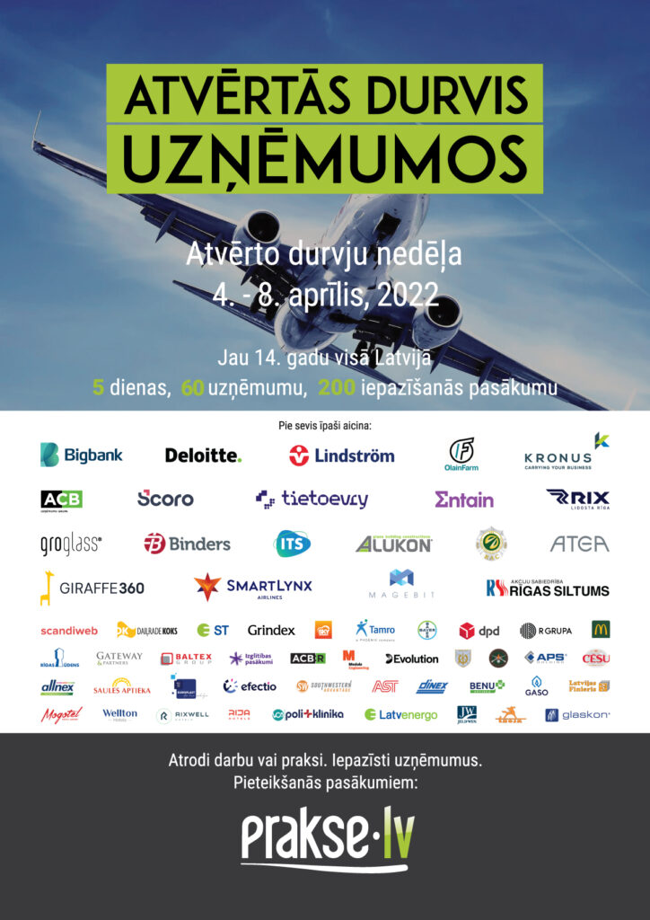 Jau 14. gadu pēc kārtas karjeras portāls Prakse.lv rīko projektu “Uzņēmumu atvērto durvju nedēļa 2022”. Tā laikā jauniešiem būs iespēja doties ekskursijās uz uzņēmumiem tiešsaistē un klātienē, lai iepazītu lieliskākos darba devējus un pieteiktos darbam un praksei, informē projekta pārstāvis Kristaps Bērziņš.