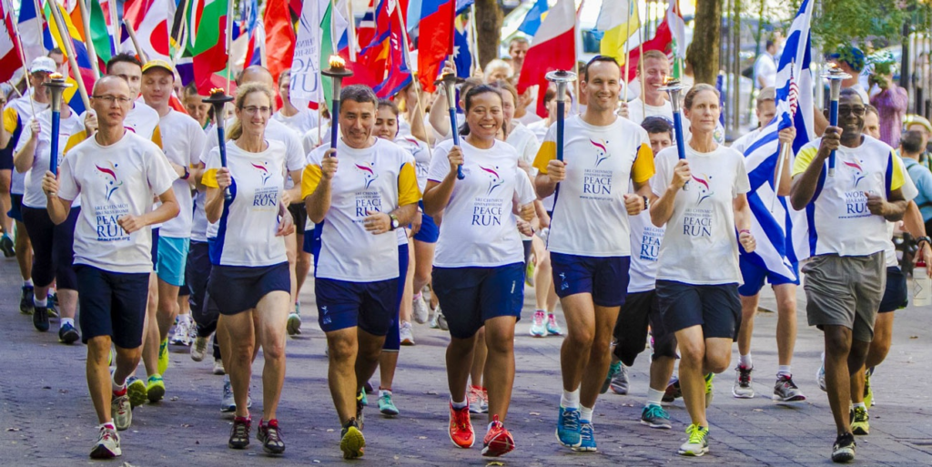 Miera skrējiena tradīcija dibināta 1987. gadā, un šobrīd šī ideja ir jo īpaši aktuāla. To iedvesmoja sportists, filozofs un mūziķis, UNESCO miera medaļas un Mahatmas Gandija miera balvas laureāts Šri Činmojs (1931–2007), kurš patiesi ticēja tam, ka sports ir spēcīgs instruments pasaules harmonijas veicināšanā. Vairāk nekā 30 gadu laikā skrējiena maršruts šķērsojis vismaz simts valstu, tajā piedalījušies miljoniem cilvēku, paužot atbalstu idejai par mieru un harmoniju pasaulē. Vairāk nekā desmit gadu skrējienā piedalās arī Latvijas komanda.
