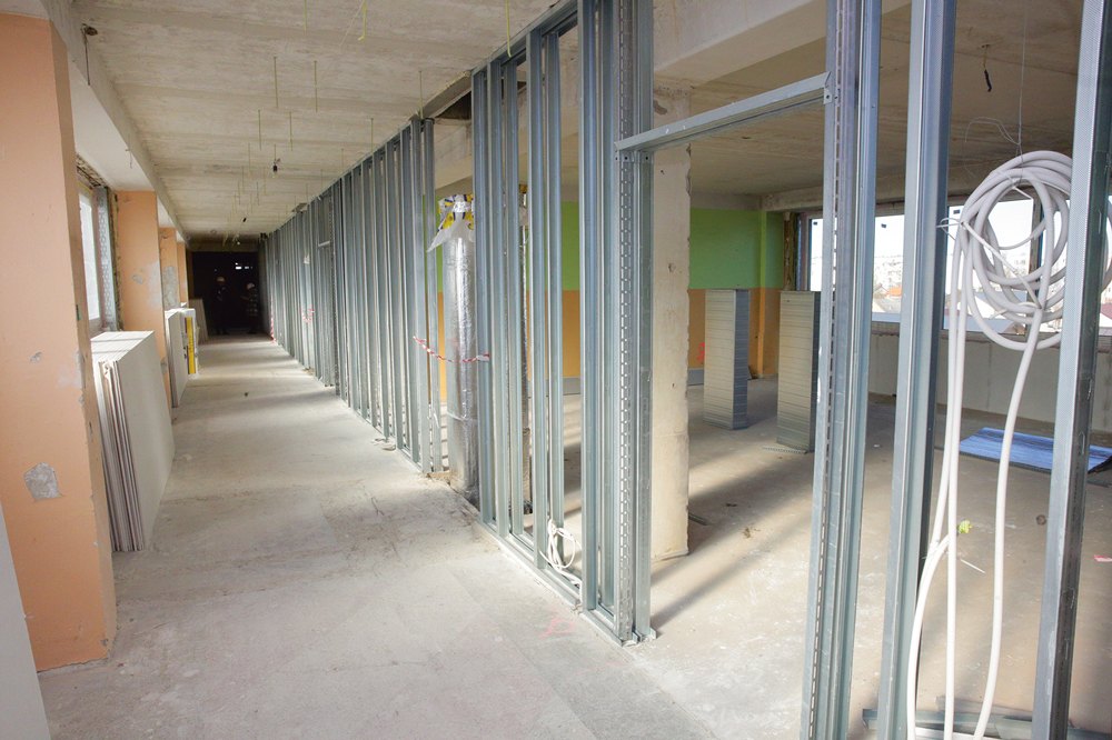 Intensīvi būvdarbi notiek telpās – tiek izbūvētas jaunas mācību klases, iekšējā ventilācijas sistēma, elektrotīkli, ūdens un kanalizācijas sistēma, kā arī pilnīgi jauna apkures sistēma. Šogad jābūt izbūvētām visām inženierkomunikācijām skolas trijos stāvos un pagrabstāvā un pabeigtiem iekšdarbiem.