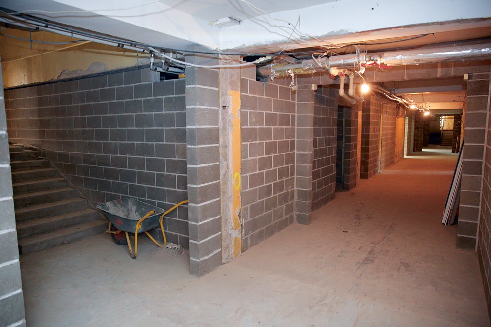 Vērienīgu pārbūvi piedzīvojis pagrabstāvs, un tas sniegs iespēju maksimāli izmantot plašās telpas, kuras līdz šim apdzīvotas daļēji. “Pēc demontāžas palika tikai karkass, bet tagad tur izveidotas jaunas telpas ar logiem. Milzīgs darbs bija hidroizolācijas sakārtošana, lai pagrabstāvā vairs nebūtu problēmu ar mitrumu,” stāsta būvdarbu vadītājs Ralfs Jurgens. Pagrabstāvā būs klašu telpas, IT centrs, ģērbtuves, aerobikas zāle, trenažieru zāle un saimnieciskās telpas.