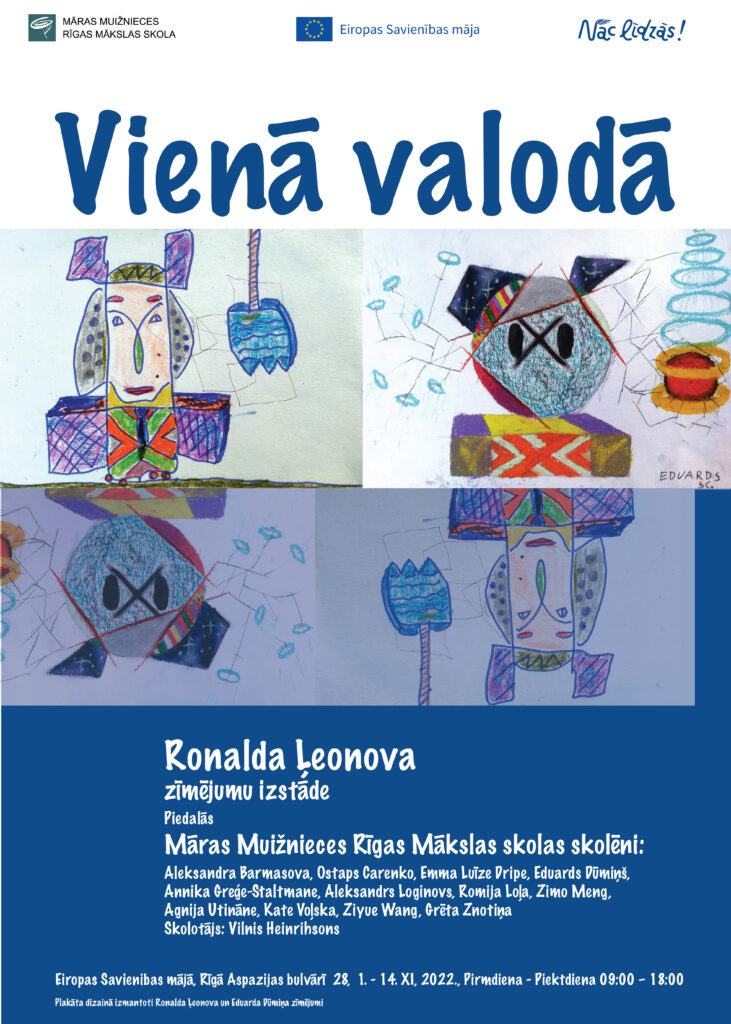 Eiropas Savienības (ES) mājā Rīgā šodien pulksten 15 atklās mākslinieka Viļņa Heinrihsona audzēkņu un VSAC “Jelgava” klienta Ronalda Ļeonova radošo darbu izstādi “Vienā valodā”, ko rīko Māras Muižnieces mākslas skola sadarbībā ar fondu “Nāc līdzās!”, informēja fondā.