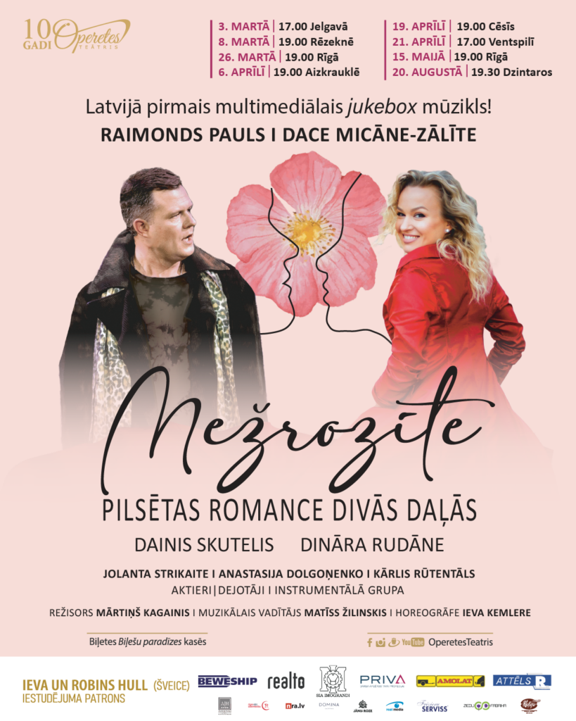 Svētdien, 3. martā, pulksten 17 Latvijā pirmais multimediālais džūkboksa mūzikls “Mežrozīte. Pilsētas romance divās daļās” ar Maestro Raimonda Paula mūziku, solistiem Dināru Rudāni, Daini Skuteli, Jolantu Strikaiti, Anastasiju Dolgoņenko, Kārli Rūtentālu un citiem viesosies Jelgavas kultūras namā. Mūzikla libreta autore ir Dace Micāne-Zālīte, režisors – Mārtiņš Kagainis, muzikālais vadītājs – Matīss Žilinskis.