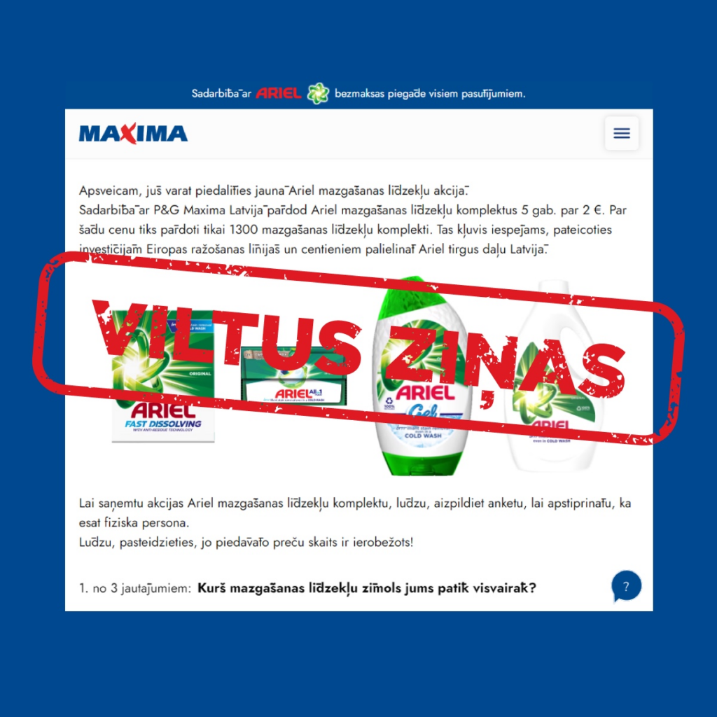 “Maxima Latvija” informē, ka ir fiksēti vairāki gadījumi, kuros iedzīvotājiem “Facebook” apmeklējuma laikā parādās aicinājums piedalīties it kā “Maxima” veidotā aptaujā, lai saņemtu “Ariel” veļas mazgāšanas kapsulas.