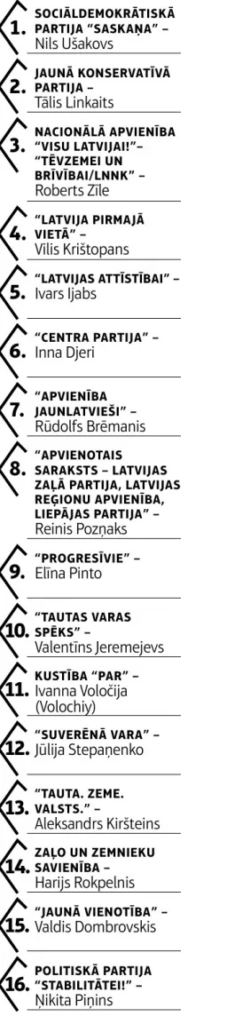 “Progresīvo” saraksta lokomotīves – pērn Valsts prezidenta amatam izvirzītā Elīna Pinto un bijušais Rīgas mērs Mārtiņš Staķis. “Apvienotā saraksta” līderis ir tviterkonvoja rīkotājs Reinis Pozņaks. Jaunās konservatīvās partijas otrais numurs ir dzejniecei un latviešu valodas kaismīgai aizstāvei Liānai Langai. “Kustības “Par!”” vēlēšanu saraksta līdere ir EP darbiniece ukrainiete Ivanna Voločija.