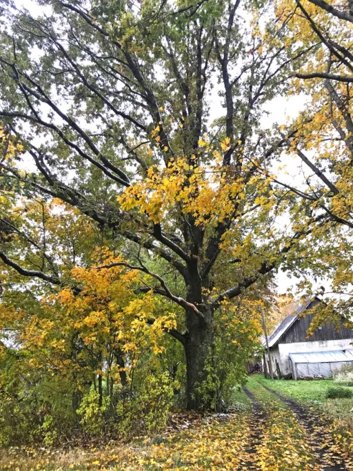- OZOLS GULBJU MĀJU PAGALMĀ. Blakus redzama siltumnīca, kur mājinieku vajadzībām vēl aizvien tiek audzēti gurķi.