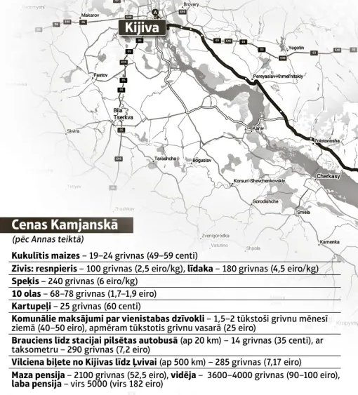 Labā krasta Kamjanskas deviņstāvu māju dzīvojamais rajons bija tīrs, sakopts, kā arī pienācīgi apdzīvots – bez tumšiem logiem. Darbojās arī lifts. Annas kundze priecājās par apciemojumu. Bija sagatavojusi bagātīgu cienastu ar ukraiņu boršču. Vēl arī olas ar diviem dzeltenumiem, Dņepras zivis, speķis. Pietrūka vienīgi tāda miera laika ekstras kā avīzes vai žurnāla, ko pirms aizmigšanas palasīt. Te gan jāpiezīmē, ka pēc Krievijas pilna mēroga uzbrukuma Ukrainā, tikai Rietumos, Ivanofrankivskā, esmu redzējis pārdošanā avīzes un žurnālus. Pat Ļvivā atradu informāciju vienīgi par ziņu portālu tvoje.misto. Drukātie bija vien tūrisma ceļveži. Sev nepieciešamo informāciju par apkārt notiekošo Annas kundze guva no mūsdienīga plakanā televizora, protams, ukraiņu kanāliem. Vēl, protams, informācijas avots bija sirēna. Tā skanēja uz turpat netālās skolas jumta. Anna teica, ka dažreiz pat astoņas reizes dienā. “Un kā ir vasarā, kad logi vaļā?!” dzīvokļa saimniece runāja tā, it kā sirēnas skaņas varētu pielīdzināt kādām nelāgām smakām vai kukaiņiem, ko caur atvērtu logu nevajadzētu laist iekšā dzīvoklī. Sirēnai skanot, iet glābties uz kādu patversmi? Tādas taču nebija. Pagrabā pietiktu vietas tikai bērniem.