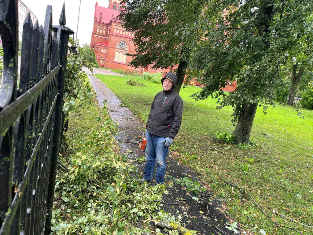 Lietainajā pirmdienas rītā prāvests Arnis Vizbelis pats ņēma rokās motorzāģi, lai strādātu pie vētras seku novēršanas.