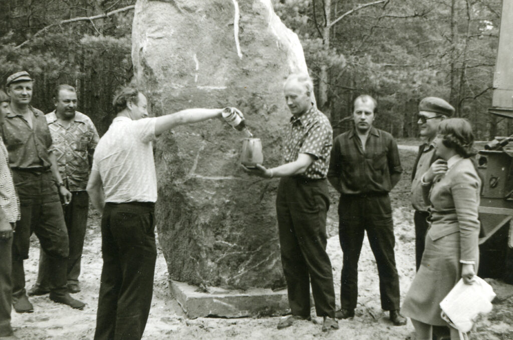 Latviešu strēlnieku piemiņas akmens uzstādīšana Ložmetējkalnā 1977. gada 14. jūlijā. Voldemārs Birznieks (centrā ar kausu) kopā ar Ozolnieku melioratoriem.