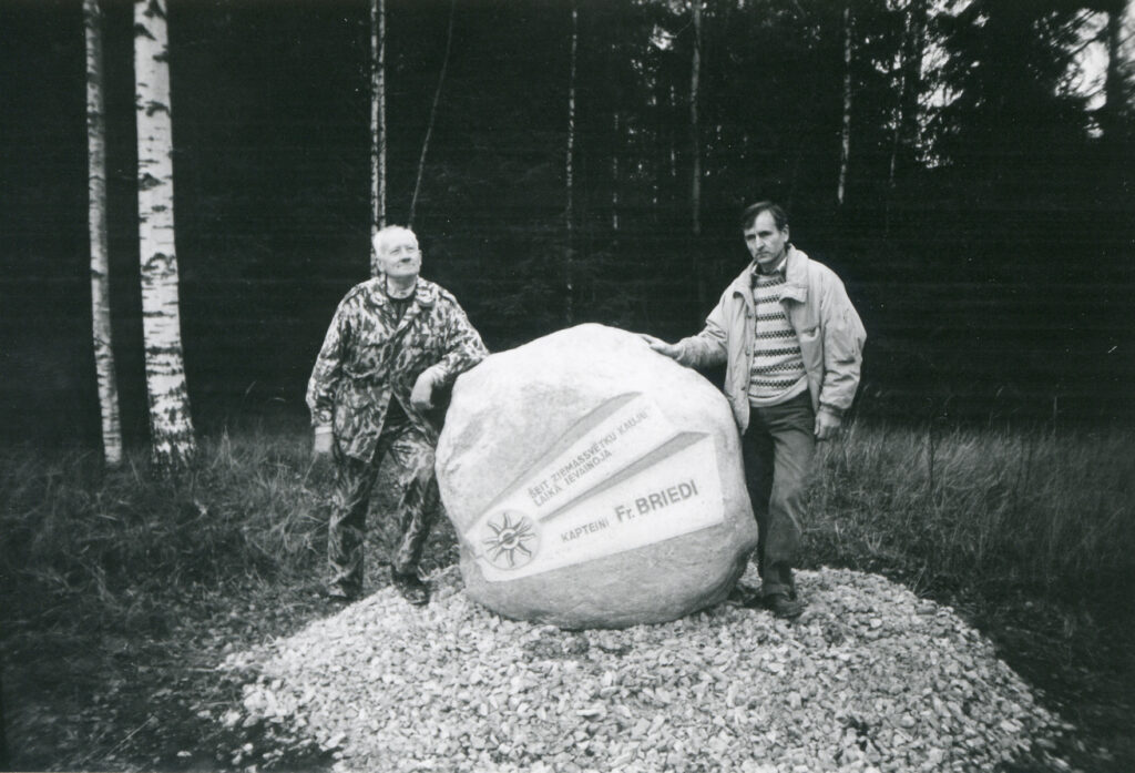 Voldemārs Birznieks kopā ar tēlnieku Vilni Titānu (1944–2006) pie piemiņas akmens strēlnieku komandierim Fridriham Briedim. Par pārsteidzošo un drosmīgo latviešu strēlnieku uzbrukumu bez artilērijas sagatavošanas, tumsas aizsegā pārgriežot dzeloņstiepļu žogus, vecie strēlnieki teica, ka tas ir “pēc pulkveža Brieža metodes”.