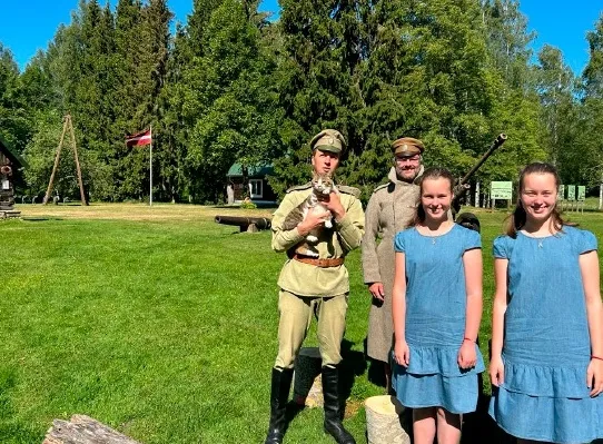 - KAFEJNĪCAS “Kauja par mārrutkiem” komanda – Ziemassvētku kauju muzeja vadītājs Dagnis Dedumietis (no kreisās), SIA ”MārLapiņi” saimnieks Māris Lapiņš ar meitām Annu un Elizabeti. Kā arī muzeja iemītnieks – kaķis Seržants.