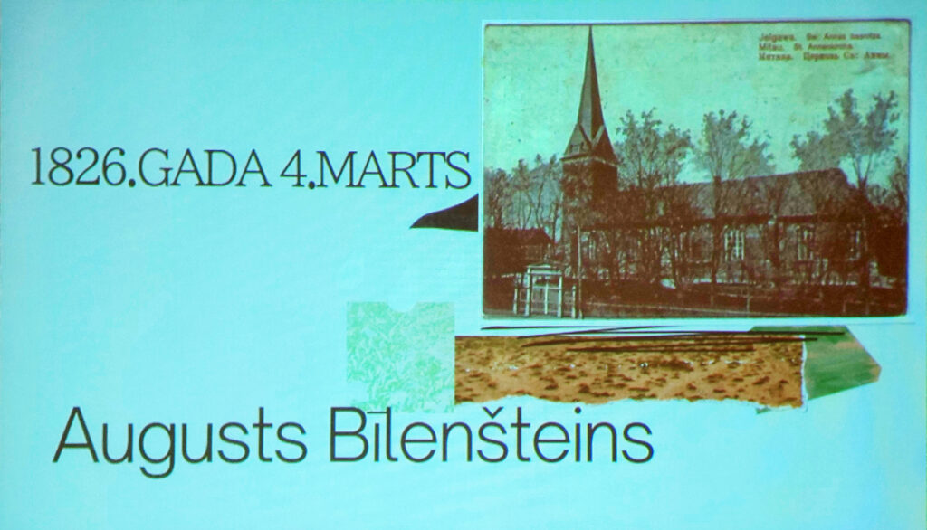 Andras Pootas prezentācijas attēlā fonā redzams Svētās Annas dievnams, kur Jelgavā dzimušais Augusts Bīlenšteins tika kristīts un kur kalpojis viņa tēvs Johans Gotfrīds Bīlenšteins.