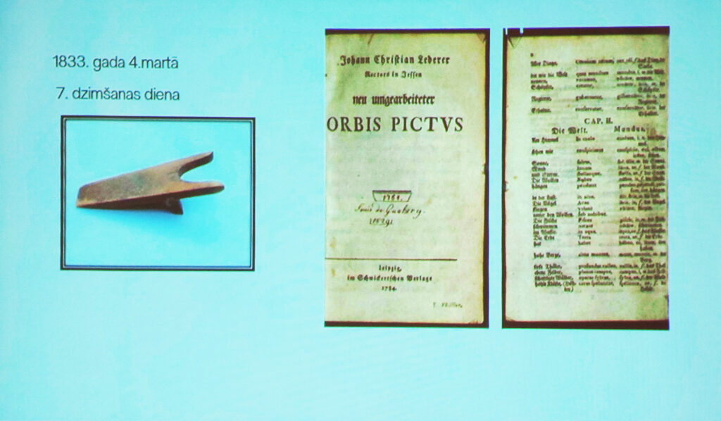 Dāvanas Augustam Bīlenšteinam viņa septītajā dzimšanas dienā. Koka ierīce ar U veida izgriezumu, ko izmanto apavu novilkšanai, un vairāk nekā 300 lapaspušu bieza mācību grāmata, no kuras lappusēm gari teksti bija jāmācās no galvas.