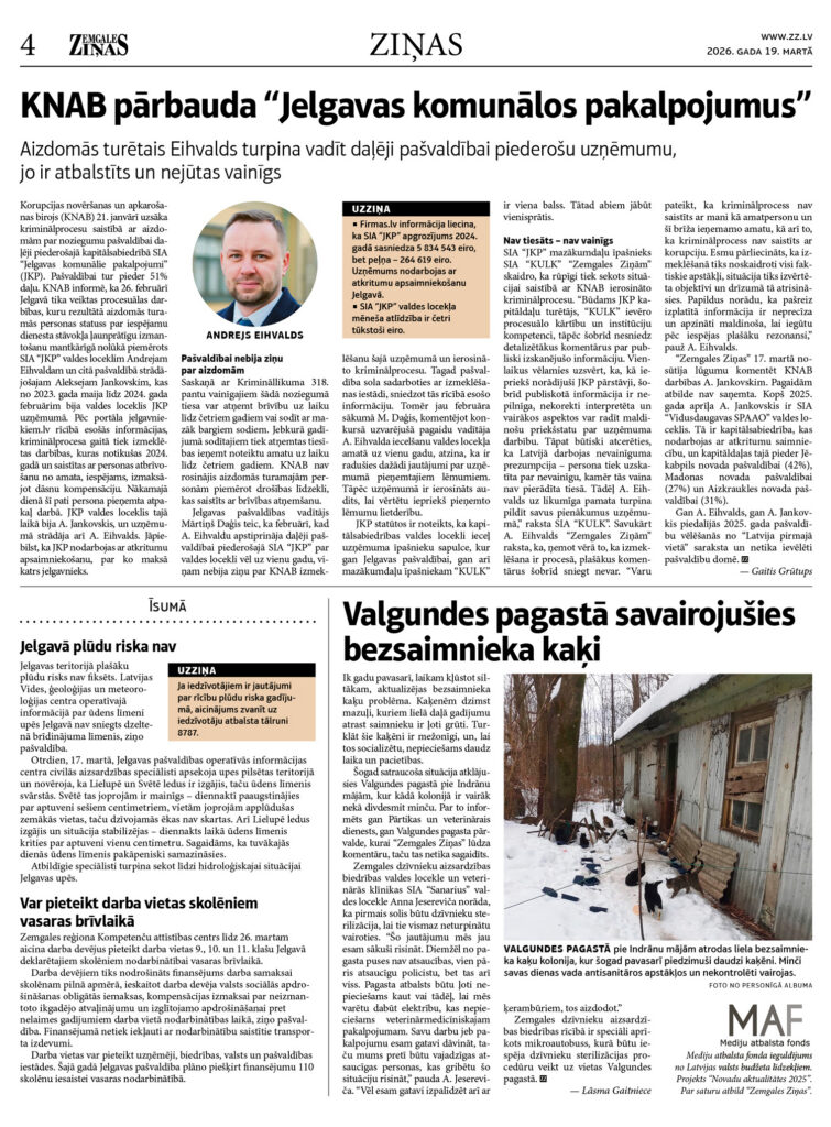 Korupcijas novēršanas un apkarošanas birojs (KNAB) 21. janvārī uzsāka kriminālprocesu saistībā ar aizdomām par noziegumu pašvaldībai daļēji piederošajā kapitālsabiedrībā SIA “Jelgavas komunālie pakalpojumi” (JKP). Pašvaldībai tur pieder 51% daļu. KNAB informē, ka 26. februārī Jelgavā tika veiktas procesuālas darbības, kuru rezultātā aizdomās turamās personas statuss par iespējamu dienesta stāvokļa ļaunprātīgu izmantošanu mantkārīgā nolūkā piemērots SIA “JKP” valdes loceklim Andrejam Eihvaldam un citā pašvaldībā strādājošajam Aleksejam Jankovskim, kas no 2023. gada maija līdz 2024. gada februārim bija valdes loceklis JKP uzņēmumā. Pēc portāla jelgavniekiem.lv rīcībā esošās informācijas, kriminālprocesa gaitā tiek izmeklētas darbības, kuras notikušas 2024. gadā un saistītas ar personas atbrīvošanu no amata, iespējams, izmaksājot dāsnu kompensāciju. Nākamajā dienā šī pati persona pieņemta atpakaļ darbā. JKP valdes loceklis tajā laikā bija A. Jankovskis, un uzņēmumā strādāja arī A. Eihvalds. Jāpiebilst, ka JKP nodarbojas ar atkritumu apsaimniekošanu, par ko maksā katrs jelgavnieks.
