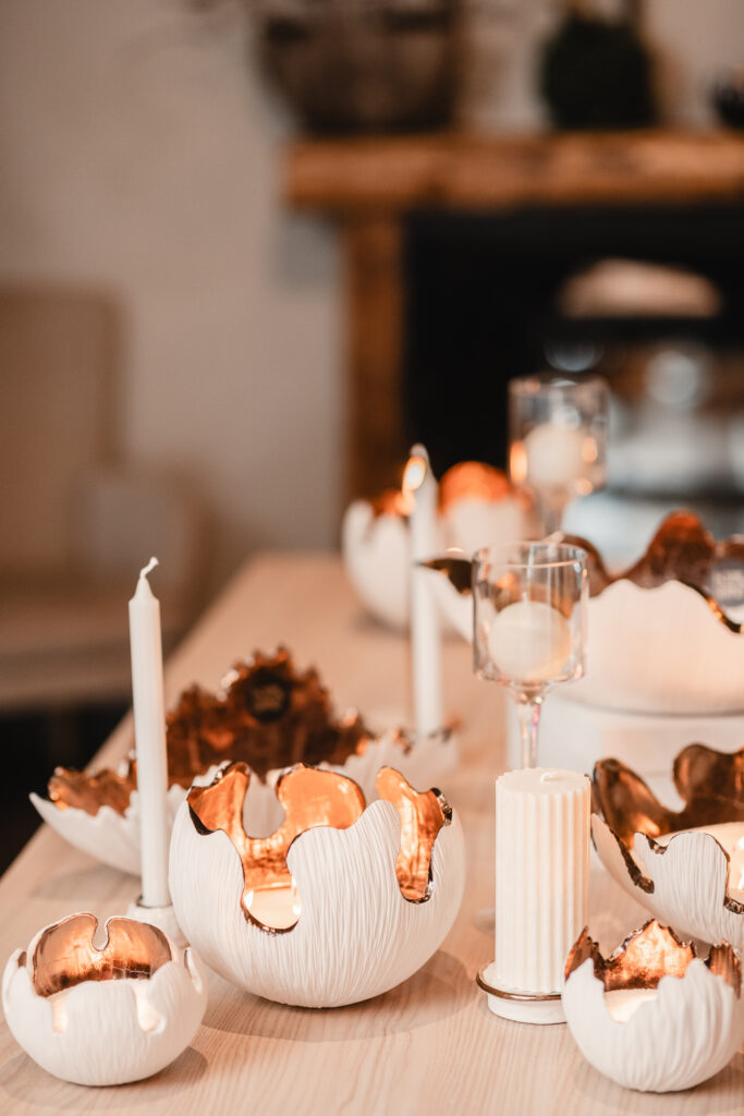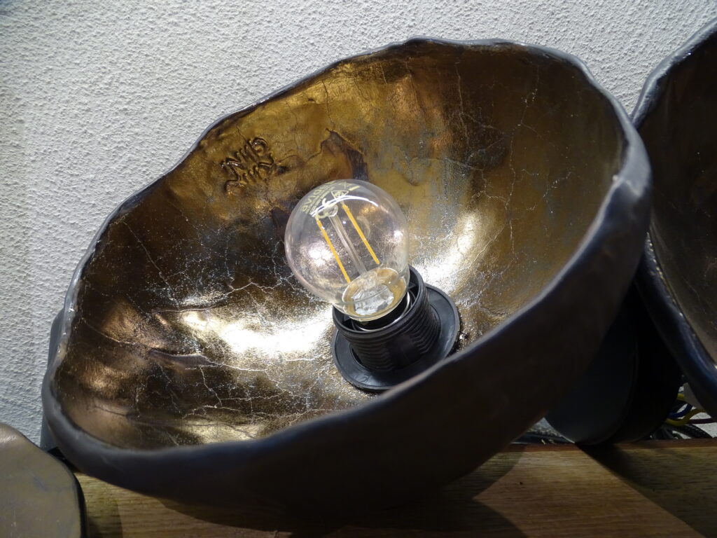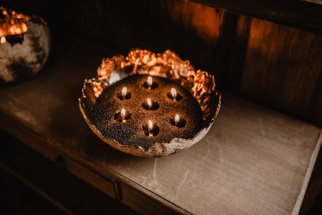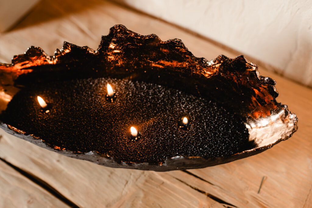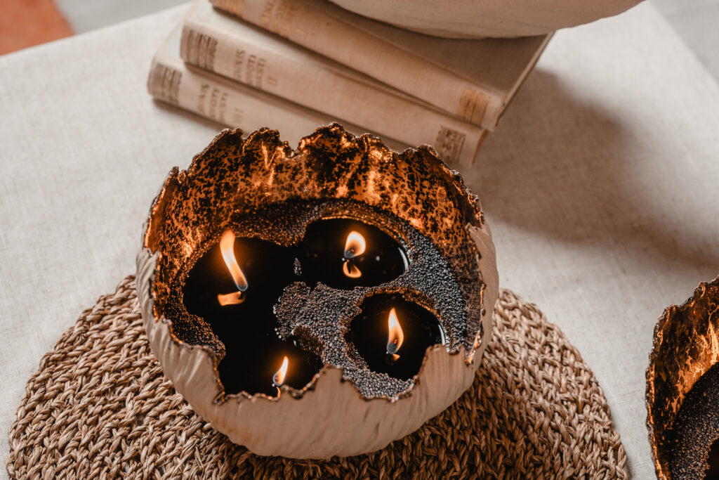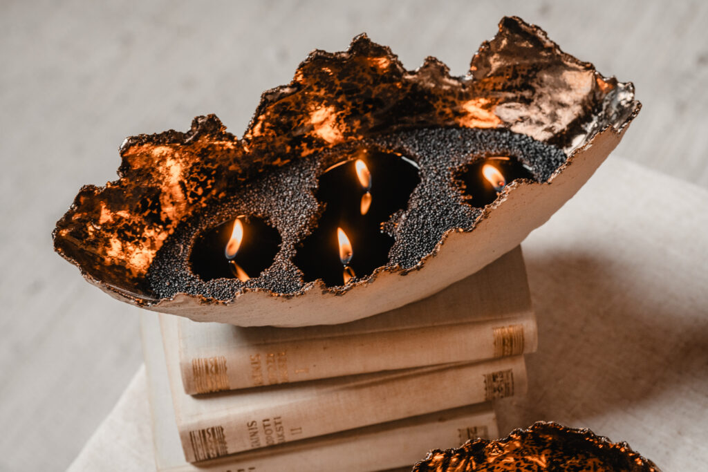Iepriekš ar mālu Dace nebija strādājusi – prasmes apguvusi gan pašmācības ceļā, gan mācoties pie pieredzējušiem keramiķiem. Liela daļa zināšanu iegūta tieši praksē – strādājot, eksperimentējot un mācoties no kļūdām, soli pa solim izkopjot savu rokrakstu. Pirmie no māla tapa plakani sveču paliktņi, bet pēcāk radās lielākas un mazākas bumbas, kur ērti ievietot tējas vai cita veida svecītes. “Daudz izmantojam arī beramās sveces, gan gaišā, gan melnā krāsā. Tumšajām pērļu vaska granulām izkūstot, rodas tumša spogulim līdzīga virsma, kas kopā ar bronzas krāsas trauka sieniņām izceļ sveču liesmiņas,” par traukā radītajām gaismas spēlēm stāsta Dace Gersone. Šobrīd uzņēmuma komanda sākusi darbu pie speciāli viņu traukam paredzētām svecēm – tādām, kas dizainiski papildinās trauka formu, būs ekoloģiski tīras un priecēs ar smaržu. Lai interjera dekoru varētu novietot arī šaurākā vietā, radās ideja par iegarenas formas traukiem – laivām, kas labi iederas, piemēram, uz kamīna malas.