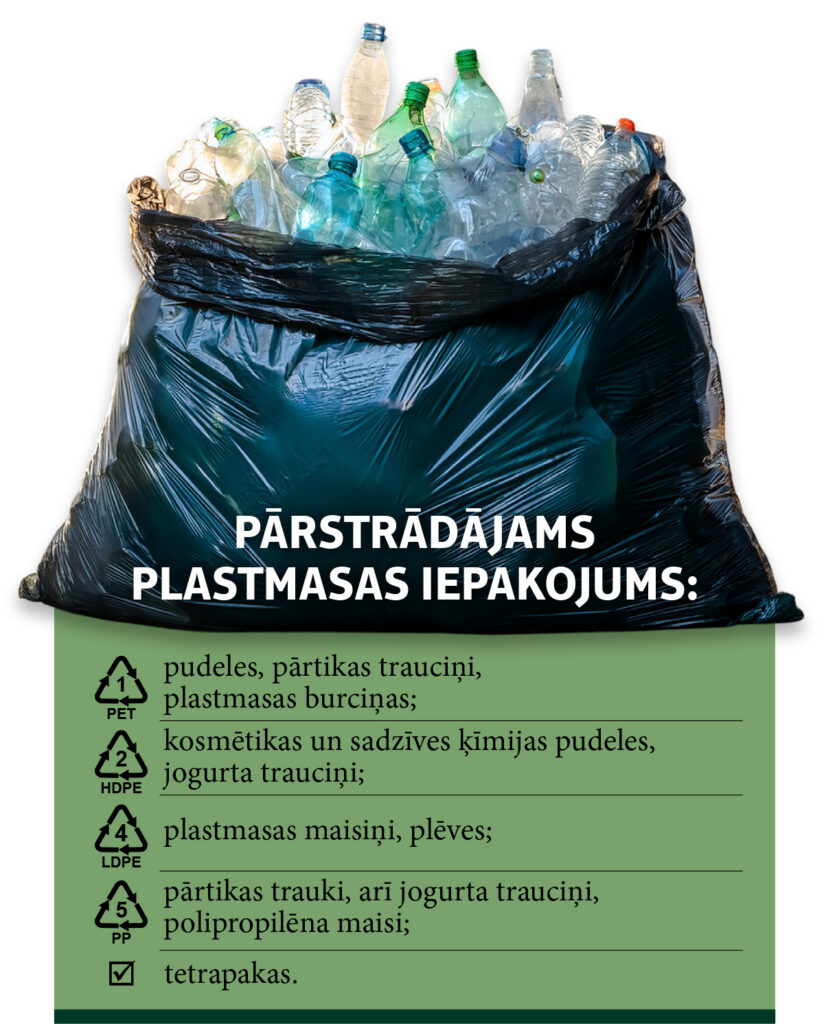 Pārstrādātais PET var pārtapt jaunās pudelēs vai tekstila šķiedrās, bet citi plastmasas veidi – sadzīves priekšmetos, būvniecības materiālos vai pat auto detaļās. Tas nozīmē, ka katrs pareizi izmests iepakojums palīdz samazināt nepieciešamību iegūt jaunus dabas resursus un mazina ietekmi uz vidi.