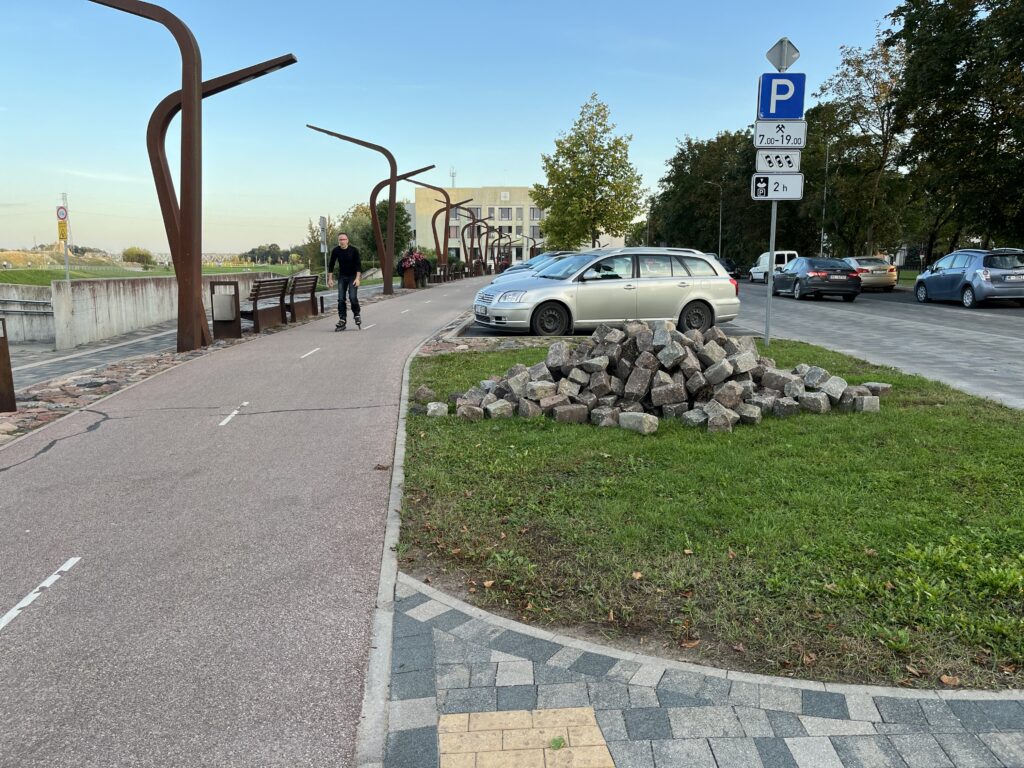 septembra pēcpusdienā par tikko remontēto jūlija beigu lietavās izskaloto gājēju ietvi liecināja bruģakmeņu krāvums.