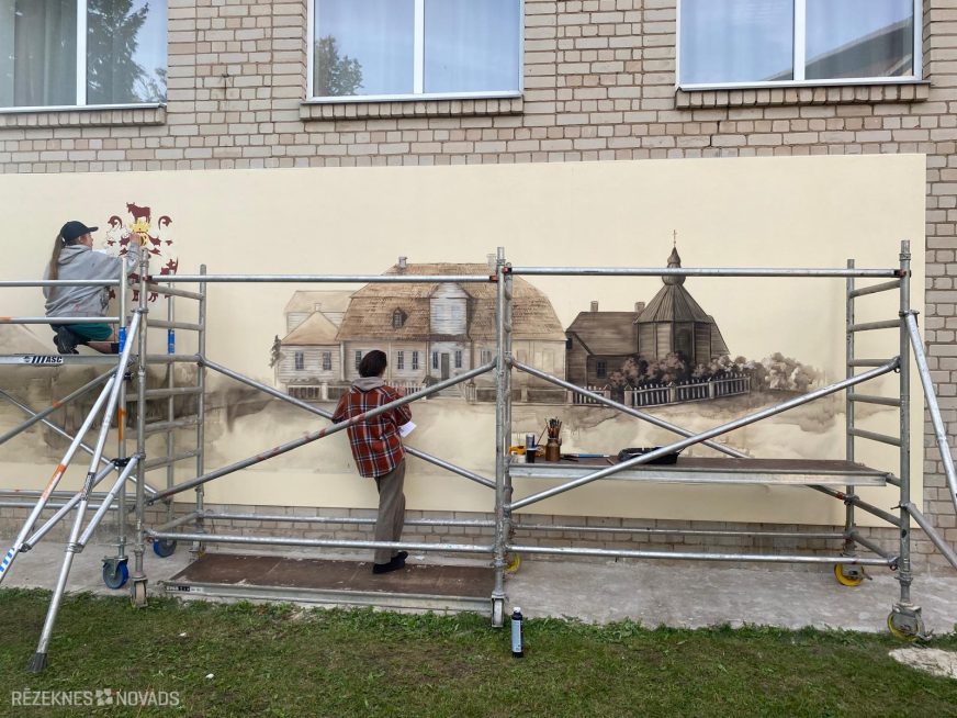 Pušas Tautas nama ēkas siena apgleznota ar senās muižas attēlu