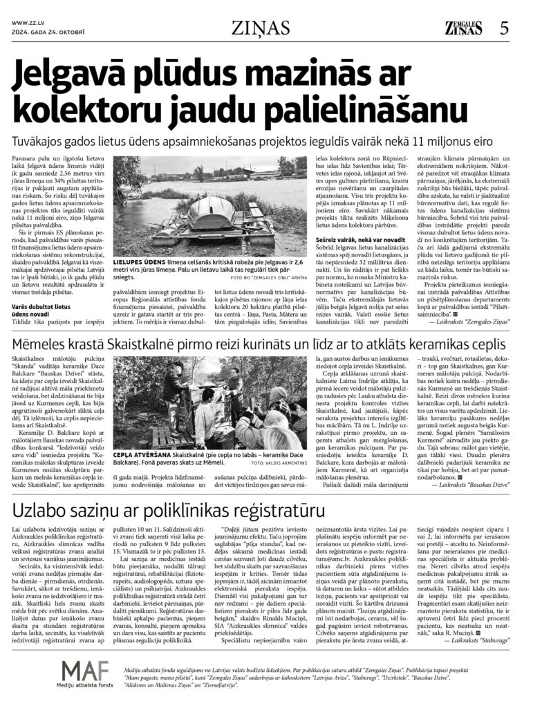 Mediju atbalsta fonda ieguldījums no Latvijas valsts budžeta līdzekļiem. Par publikācijas saturu atbild “Zemgales Ziņas”. Publikācija tapusi projektā “Mans pagasts, mana pilsēta”, kurā “Zemgales Ziņas” sadarbojas ar laikrakstiem “Latvijas Avīze”, “Staburags”, “Dzirkstele”, “Bauskas Dzīve”, “Alūksnes un Malienas Ziņas” un “Ziemeļlatvija”.