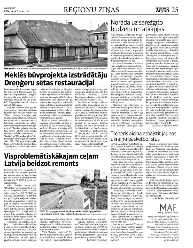 | Mediju atbalsta fonda ieguldījums no Latvijas valsts budžeta līdzekļiem. Projekts “Mans pagasts, mana pilsēta”. Par publikāciju saturu atbild “Zemgales Ziņas” Publikācijas tapušas, “Zemgales Ziņām” sadarbojoties ar laikrakstiem “Latvijas Avīze”, “Staburags”, “Dzirkstele”, “Bauskas Dzīve”, “Alūksnes un Malienas Ziņas” un “Ziemeļlatvija” | |