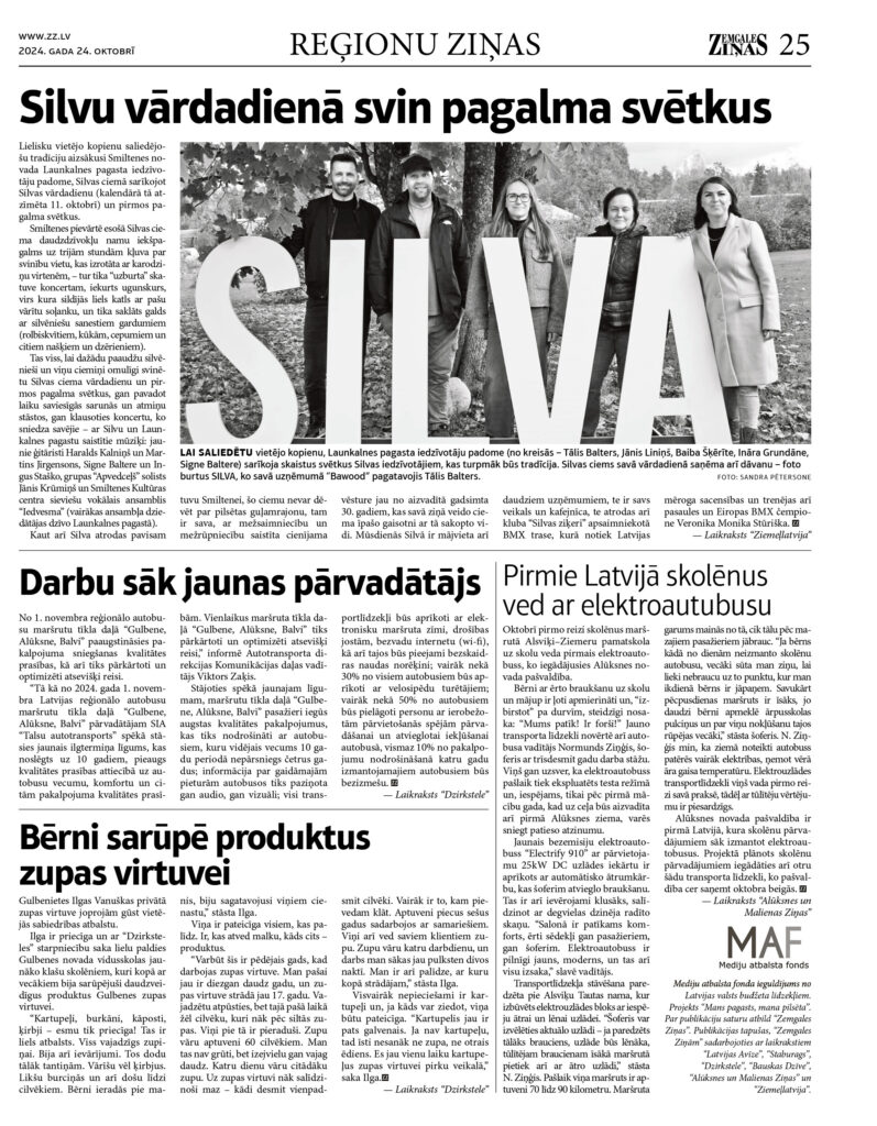 Mediju atbalsta fonda ieguldījums no Latvijas valsts budžeta līdzekļiem. Projekts “Mans pagasts, mana pilsēta”. Par publikāciju saturu atbild “Zemgales Ziņas”. Publikācijas tapušas, “Zemgales Ziņām” sadarbojoties ar laikrakstiem “Latvijas Avīze”, “Staburags”, “Dzirkstele”, “Bauskas Dzīve”, “Alūksnes un Malienas Ziņas” un “Ziemeļlatvija”.