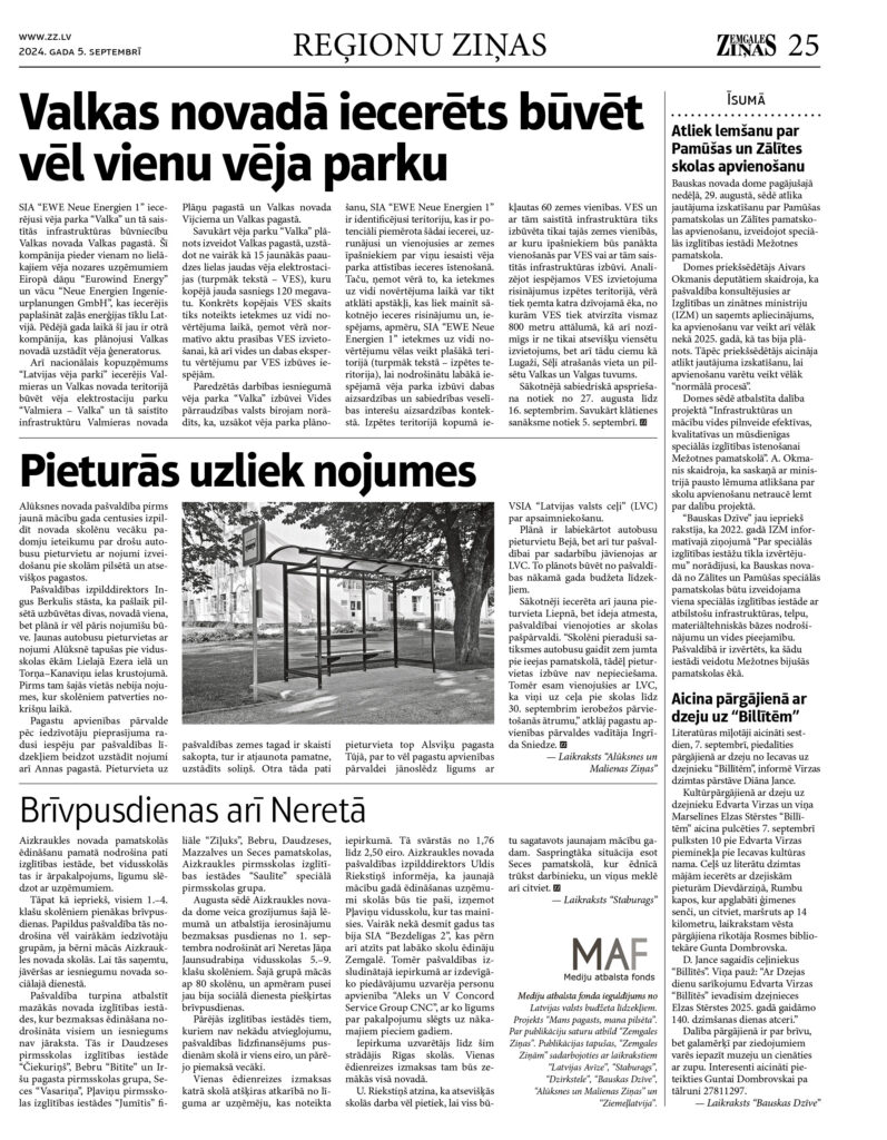 Mediju atbalsta fonda ieguldījums no Latvijas valsts budžeta līdzekļiem. Projekts “Mans pagasts, mana pilsēta”. Par publikāciju saturu atbild “Zemgales Ziņas”. Publikācijas tapušas, “Zemgales Ziņām” sadarbojoties ar laikrakstiem “Latvijas Avīze”, “Staburags”, “Dzirkstele”, “Bauskas Dzīve”, “Alūksnes un Malienas Ziņas” un “Ziemeļlatvija”.