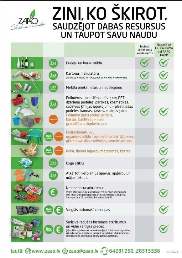 SIA “ZAAO” ir radusi iespēju pārstrādei nodot vēl vairākus atkritumu veidus. Turpmāk bez maksas kā šķirotos atkritumus var nodot arī polimēra puķu podus, grozus, kastes, kastītes (PP, HDPE), granulētu putuplastu (EPS), organisko stiklu – polimetilmetakrilātu (PMMA), polikarbonātu (PC), polimēra caurules un dārza mēbeles (HDPE, PP), koka un finiera iepakojuma kastes, paletes. Tie jāmet dalītās vākšanas konteinerā, kas paredzēts vieglajam iepakojumam.