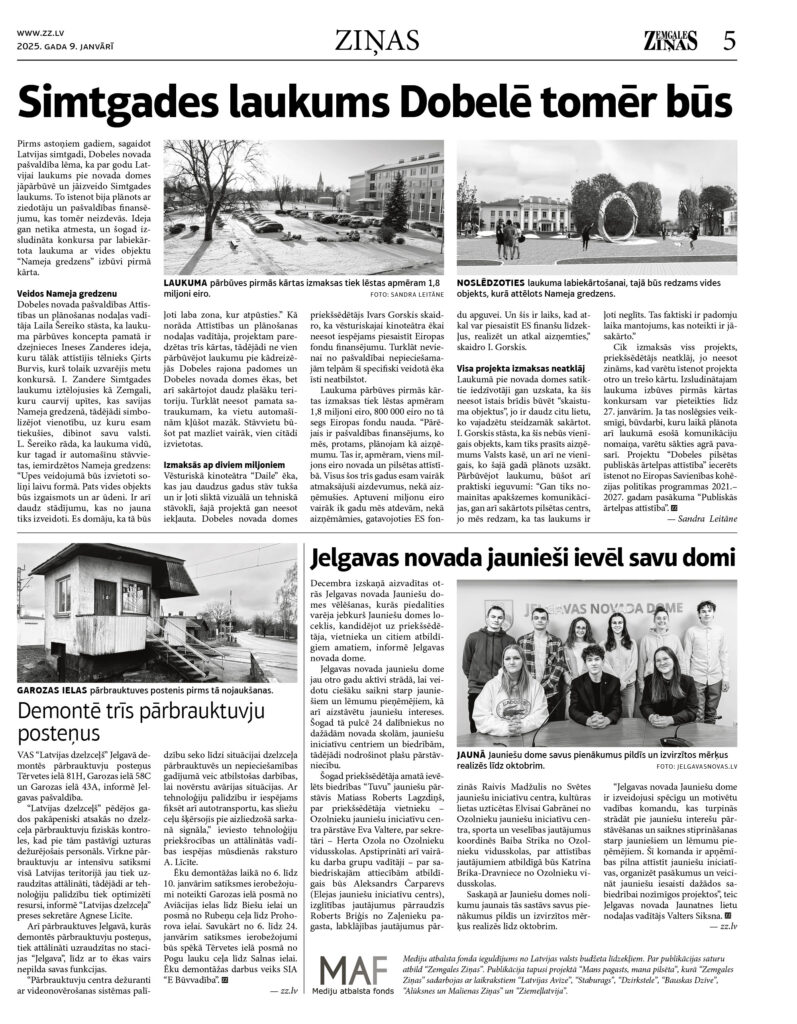 Mediju atbalsta fonda ieguldījums no Latvijas valsts budžeta līdzekļiem. Par publikācijas saturu atbild “Zemgales Ziņas”. Publikācija tapusi projektā “Mans pagasts, mana pilsēta”, kurā “Zemgales Ziņas” sadarbojas ar laikrakstiem “Latvijas Avīze”, “Staburags”, “Dzirkstele”, “Bauskas Dzīve”, “Alūksnes un Malienas Ziņas” un “Ziemeļlatvija”.