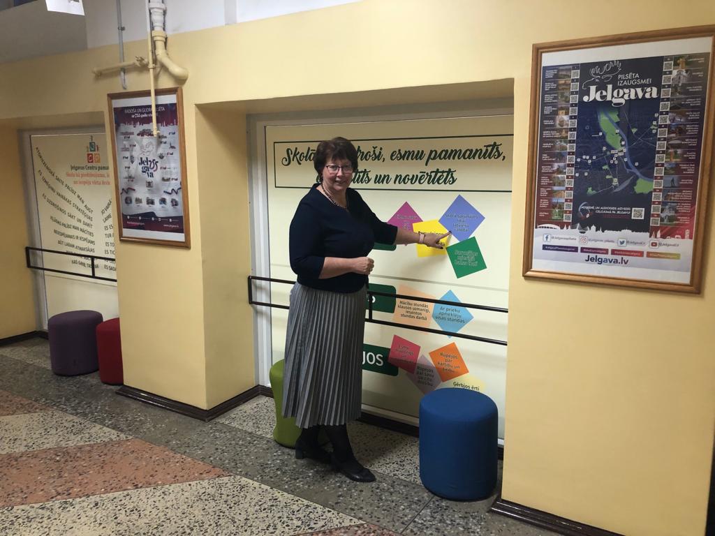 • JELGAVAS Centra pamatskolas direktore Agita Ozoliņa pie pašas jaunieveduma – “runājošās sienas”.
