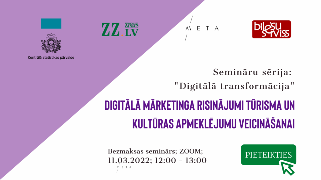Lai uzzinātu jaunākos digitālā mārketinga risinājumus tūrisma un kultūras apmeklējumu veicināšanai un dalītos pieredzē, 11. martā plkst. 12:00 – 13:00 notiks vebinārs nozares profesionāļiem un interesentiem.